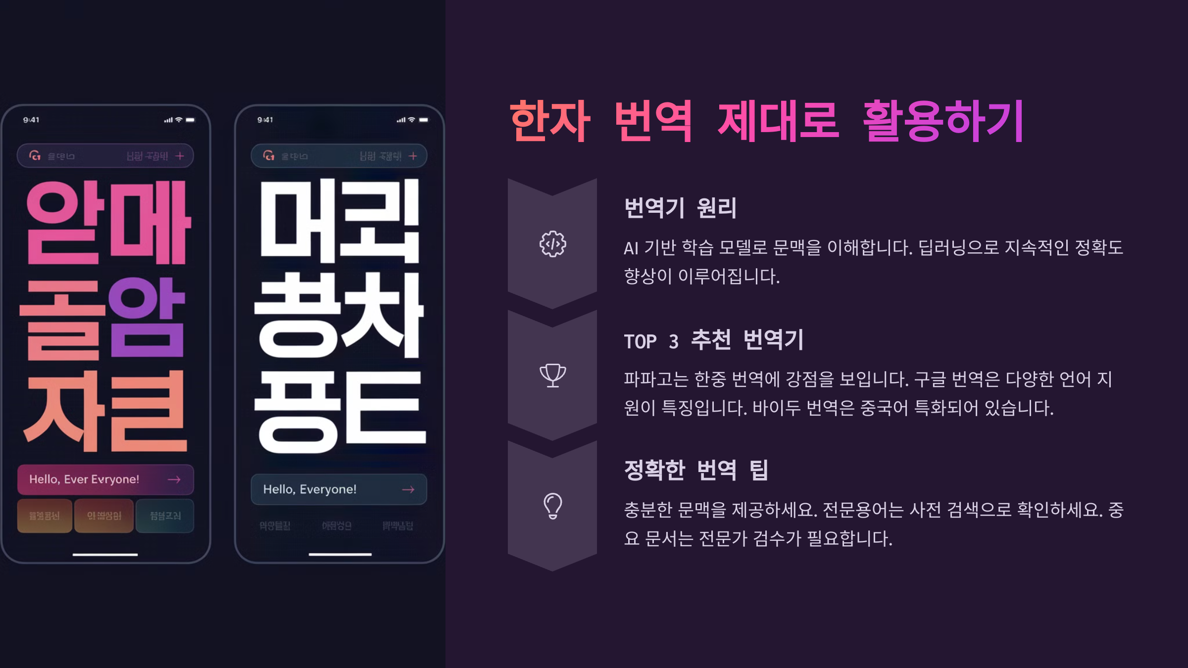 | ์ ํํ ๋ฒ์ญ ํ | ๋ฌธ๋งฅ ๊ณ ๋ ค, ๋ค์ค ๋ฒ์ญ๊ธฐ ๋น๊ต, OCR ๊ธฐ๋ฅ ํ์ฉ |