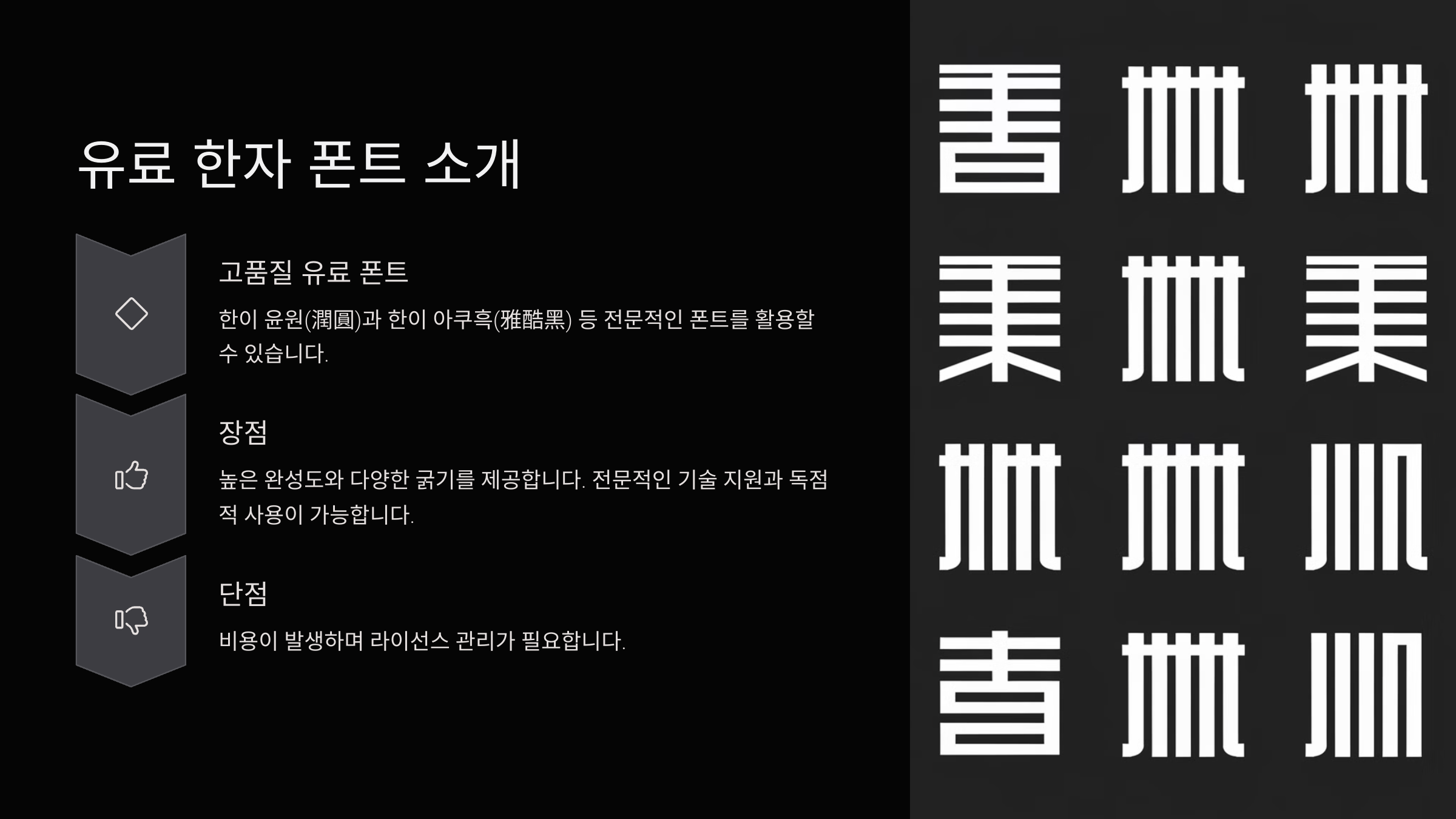 ๊ฐ์ฅ ํฐ ๋จ์ ์ ๋น์ฉ์ ๋๋ค. ์ผ๋ถ ๊ณ ๊ธ ํฐํธ๋ ์์ญ๋ง ์ ์ด์์ ๋ผ์ด์ ์ค ๋น์ฉ์ด ๋ฐ์ํ๋ฉฐ, ์ฌ์ฉ ๋ฒ์์ ๋ฐ๋ผ ์ถ๊ฐ ์๊ธ์ด ๋ถ๊ณผ๋ ์ ์์ต๋๋ค. ๋ํ ํน์ ํ๋ก๊ทธ๋จ์์๋ง ์ฌ์ฉํ ์ ์๋ ๊ฒฝ์ฐ๋ ์์ด ํธํ์ฑ์ ๋ฐ๋์ ํ์ธํด์ผ ํฉ๋๋ค.