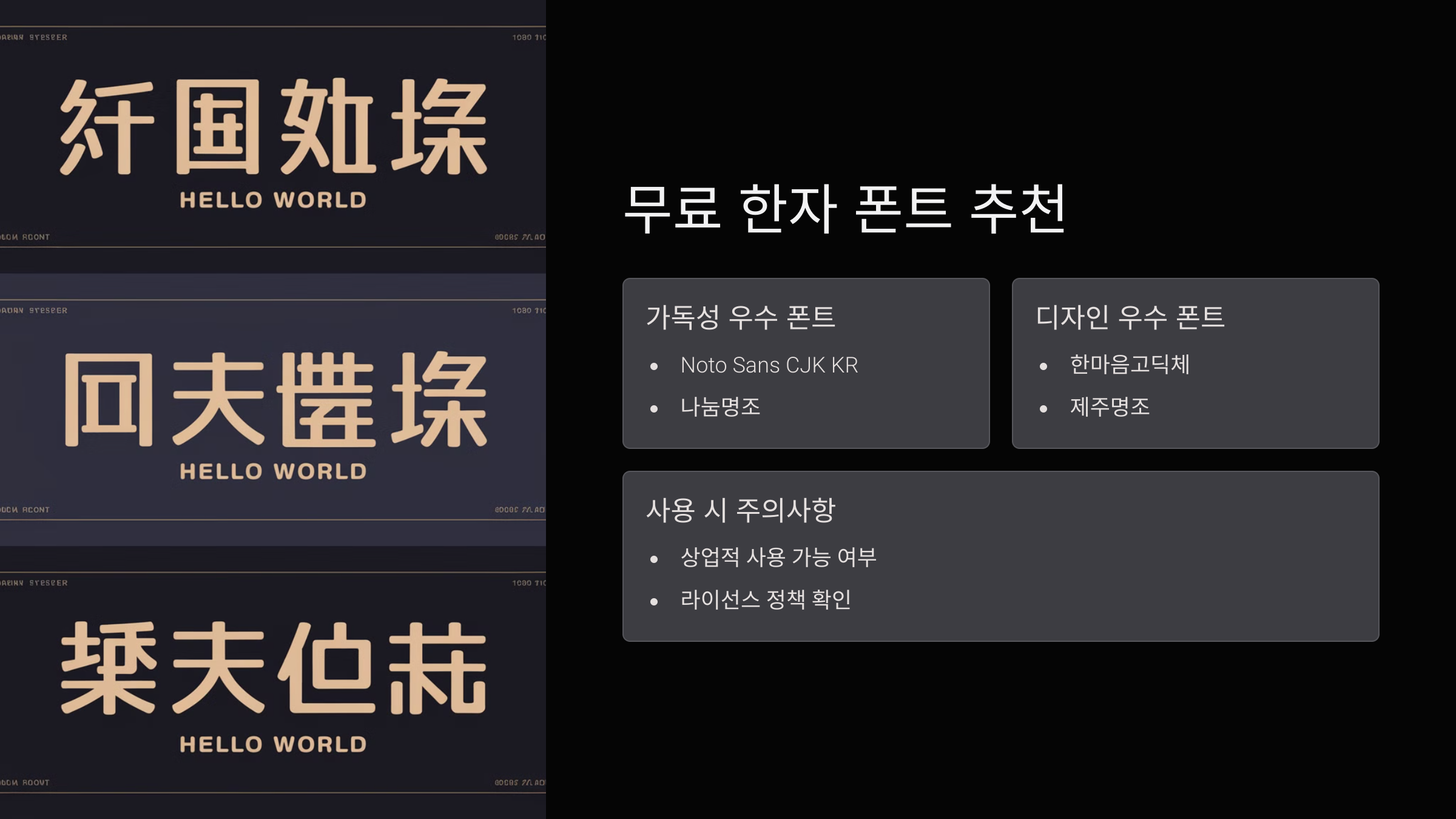 A: ์ผ๋ถ ๋ฌด๋ฃ ํ์ ํฐํธ๋ ์์ ์ ์ฌ์ฉ์ด ๊ฐ๋ฅํ์ง๋ง, ๋ผ์ด์ ์ค๋ง๋ค ๋ค๋ฅด๋ฏ๋ก ์ฌ์ฉ ์ ์ ๋ฐ๋์ ํ์ธํด์ผ ํฉ๋๋ค. ์๋ฅผ ๋ค์ด, Noto Sans CJK๋ ์์ ์ ์ผ๋ก ์์ ๋กญ๊ฒ ์ฌ์ฉํ ์ ์์ง๋ง, ์ผ๋ถ ํฐํธ๋ ์ ํ์ด ์์ ์ ์์ต๋๋ค.