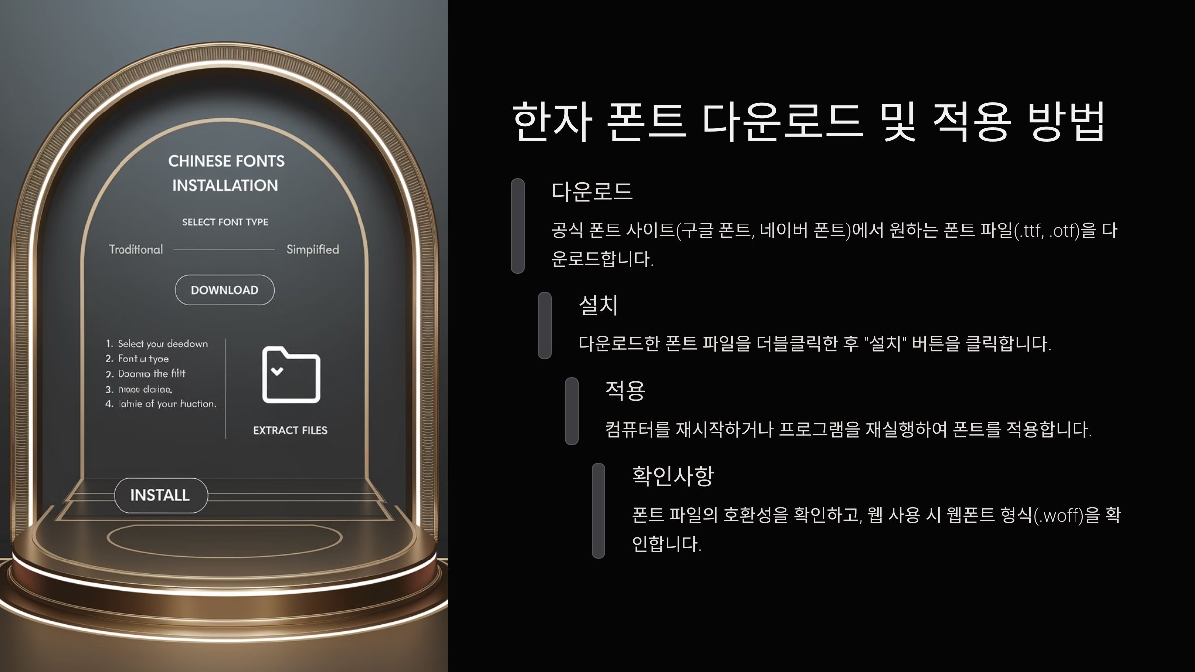 ํ์ ํฐํธ๋ฅผ ๋ค์ด๋ก๋ํ ํ ์ค์นํ๋ ๋ฐฉ๋ฒ์ ์ด์์ฒด์ ๋ณ๋ก ๋ค๋ฅผ ์ ์์ต๋๋ค. ์ผ๋ฐ์ ์ผ๋ก ์๋์ฐ์์๋ ๋ค์ด๋ก๋ํ ํฐํธ ํ์ผ์ ๋๋ธ ํด๋ฆญํ์ฌ ์ค์นํ ์ ์์ผ๋ฉฐ, macOS์์๋ ‘Font Book’์ ํตํด ์์ฝ๊ฒ ์ถ๊ฐํ ์ ์์ต๋๋ค.