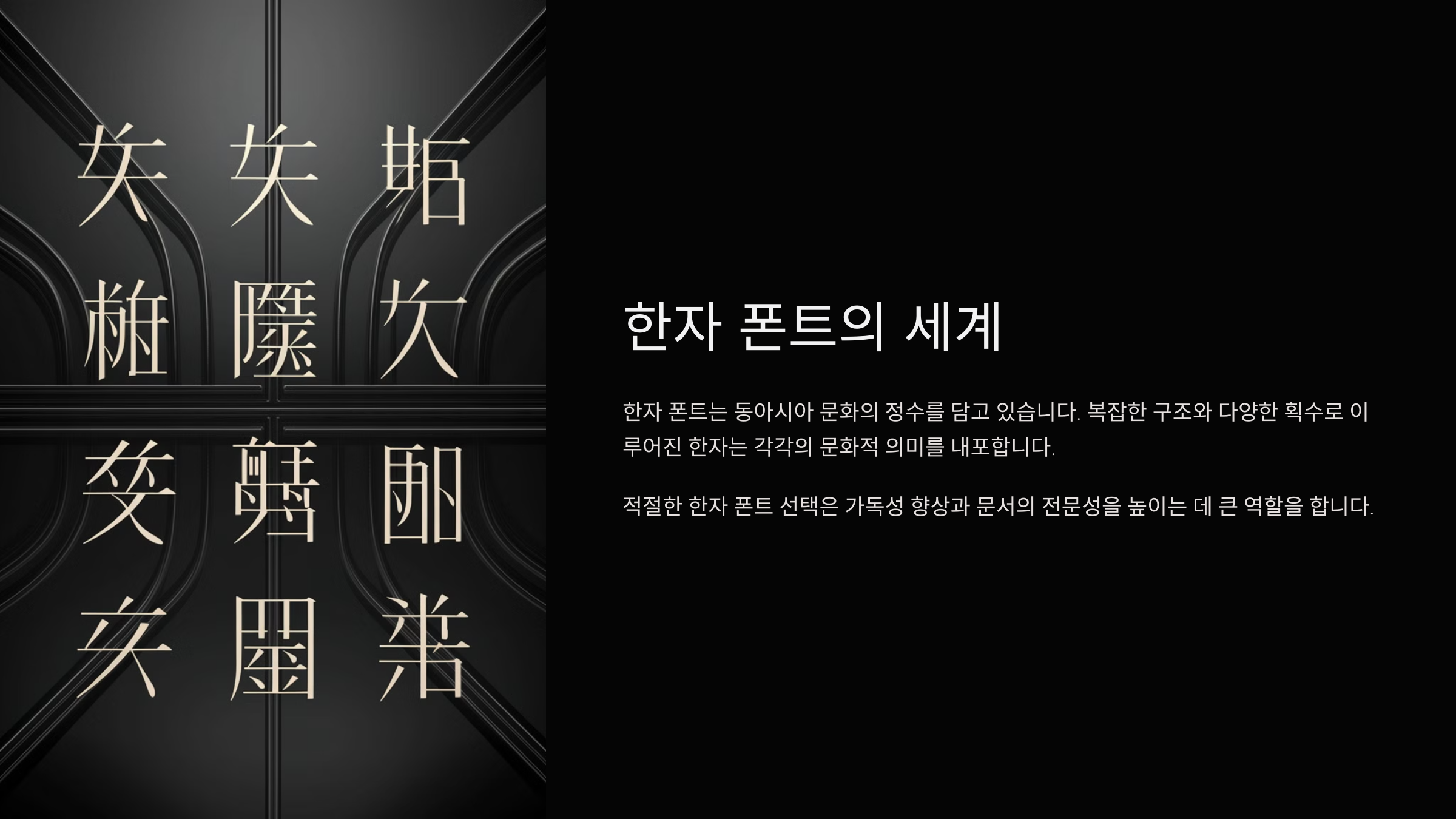 ํ์ ํฐํธ๋ ๋ฌธ์์ ์ ๋ฌธ์ฑ๊ณผ ์ ๋ขฐ๋๋ฅผ ๋์ด๋ ์ค์ํ ์ญํ ์ ํฉ๋๋ค. ํนํ ์ ํต์ ์ธ ๋๋์ ์ด๋ฆฌ๊ฑฐ๋ ๊ณต์ ๋ฌธ์์์ ์ฌ์ฉ๋ ๊ฒฝ์ฐ ์ ์ ํ ํฐํธ ์ ํ์ด ํ์์ ์ ๋๋ค.